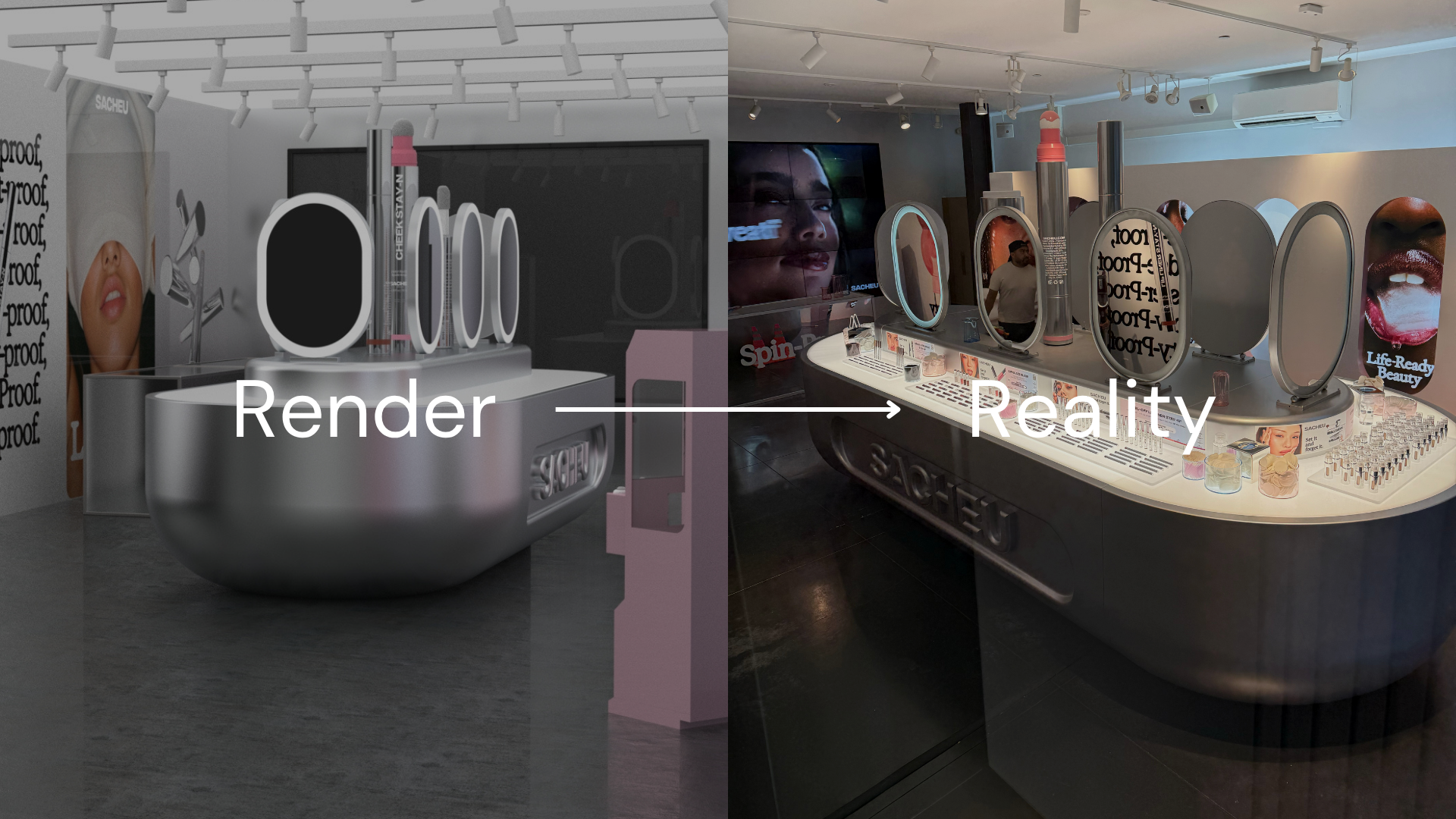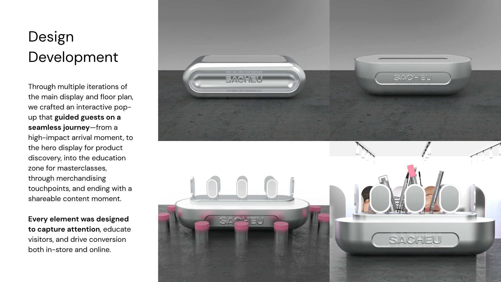 Led the design and development of Sacheu Beauty's Los Angeles pop-up experience. The two-level installation brought the brand’s high-glow, mirror-finish identity into physical form, guiding guests through interactive discovery zones, education areas, and shareable content moments. Every material and layout decision was crafted to balance aesthetics, functionality, and storytelling.